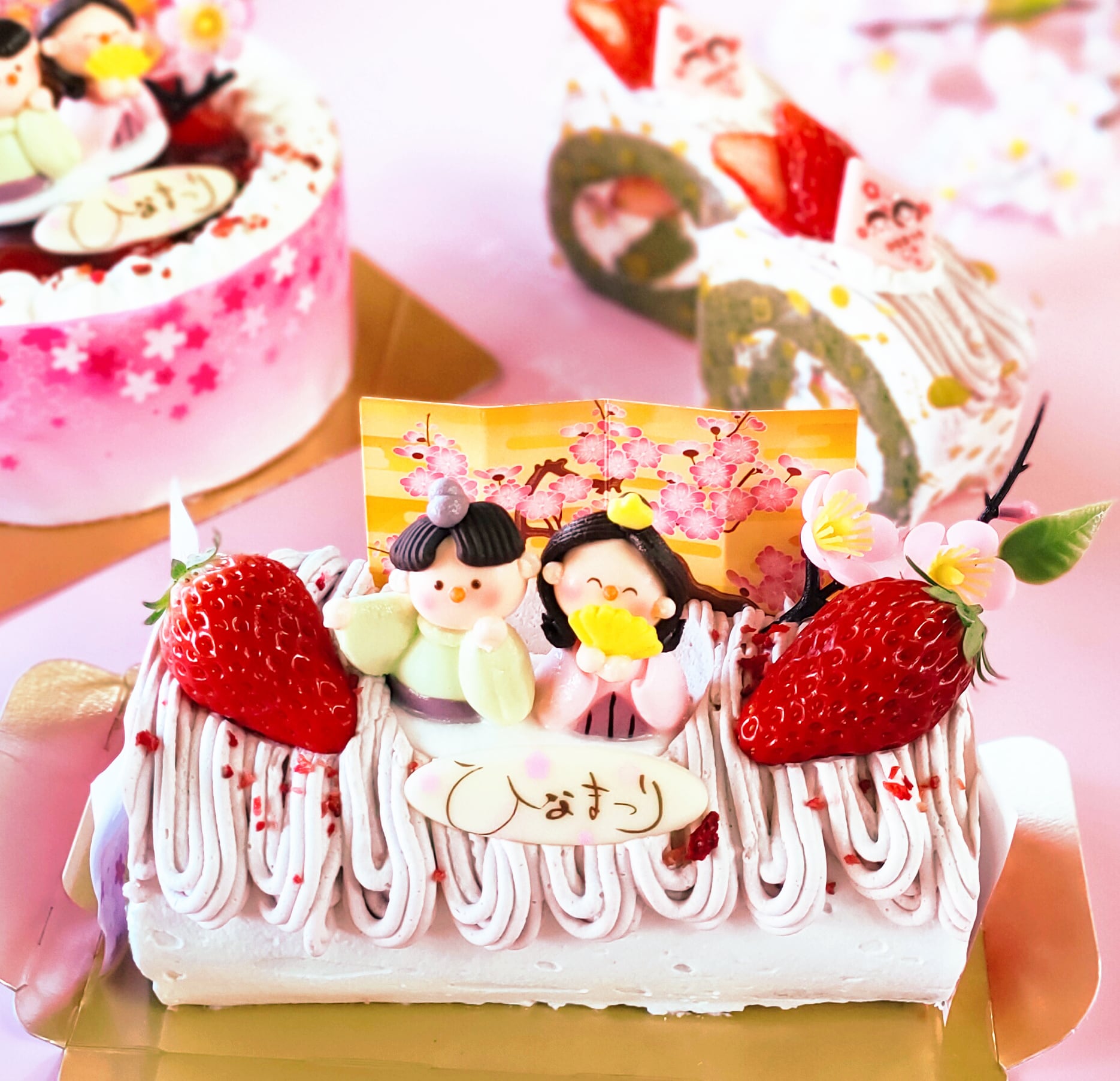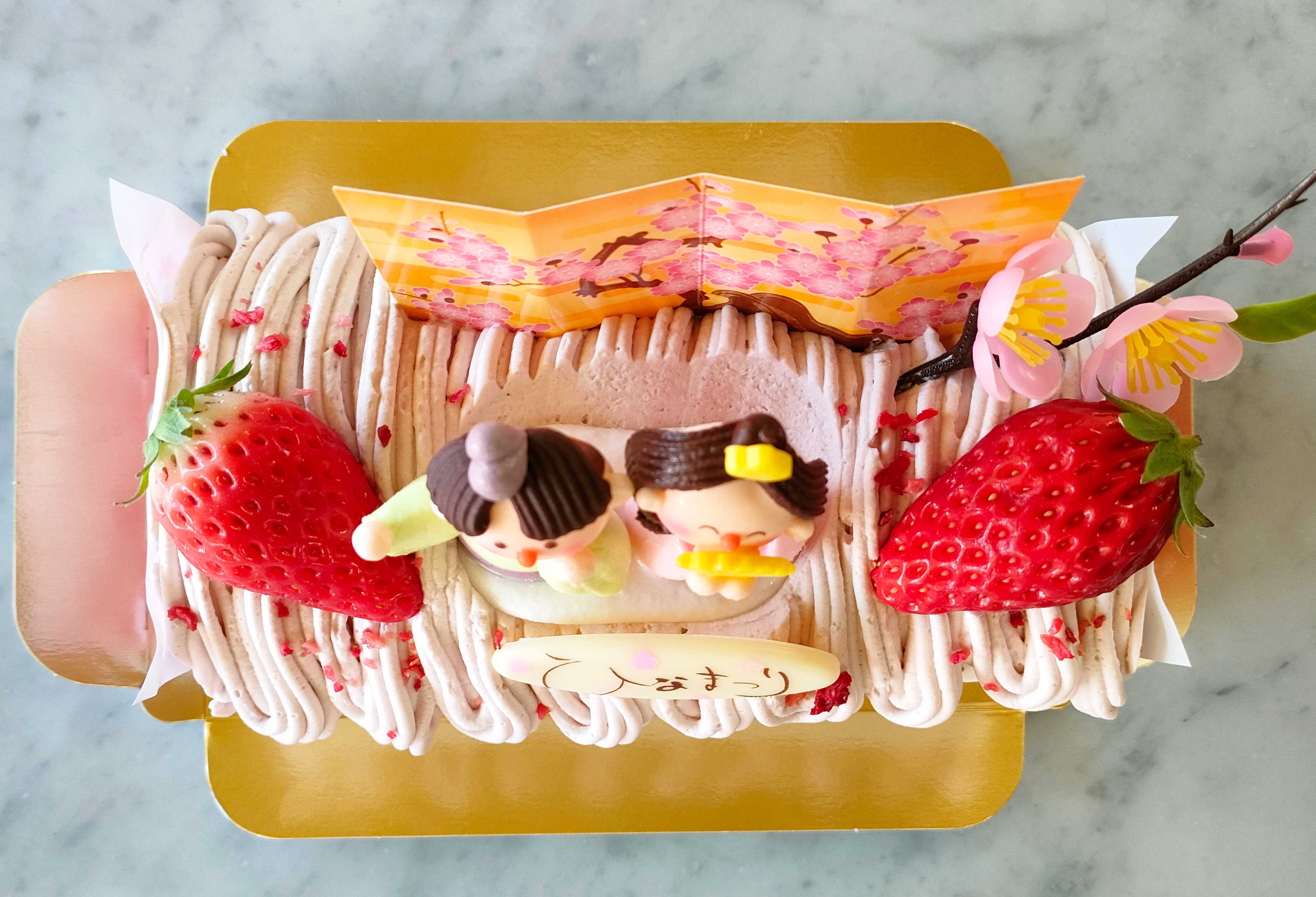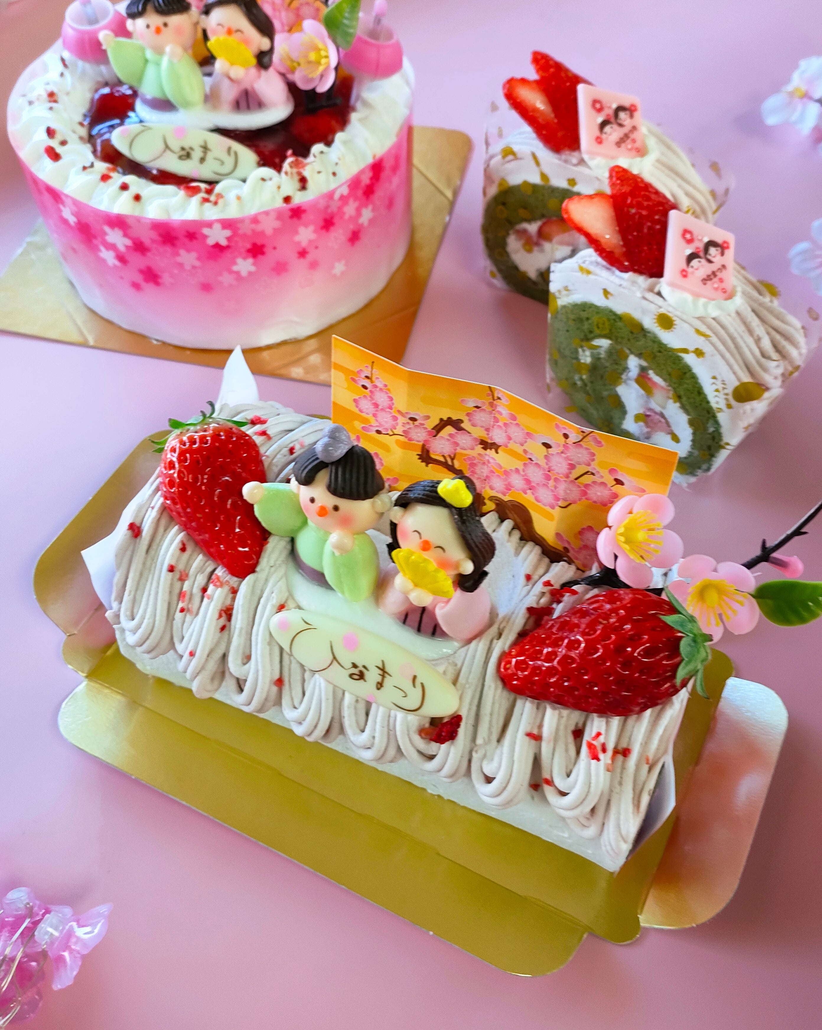 抹茶の生地でたっぷりのシャンティと苺を巻き込み、上には苺風味のクリームをしぼりおひな祭りの華やかな雰囲気を演出。