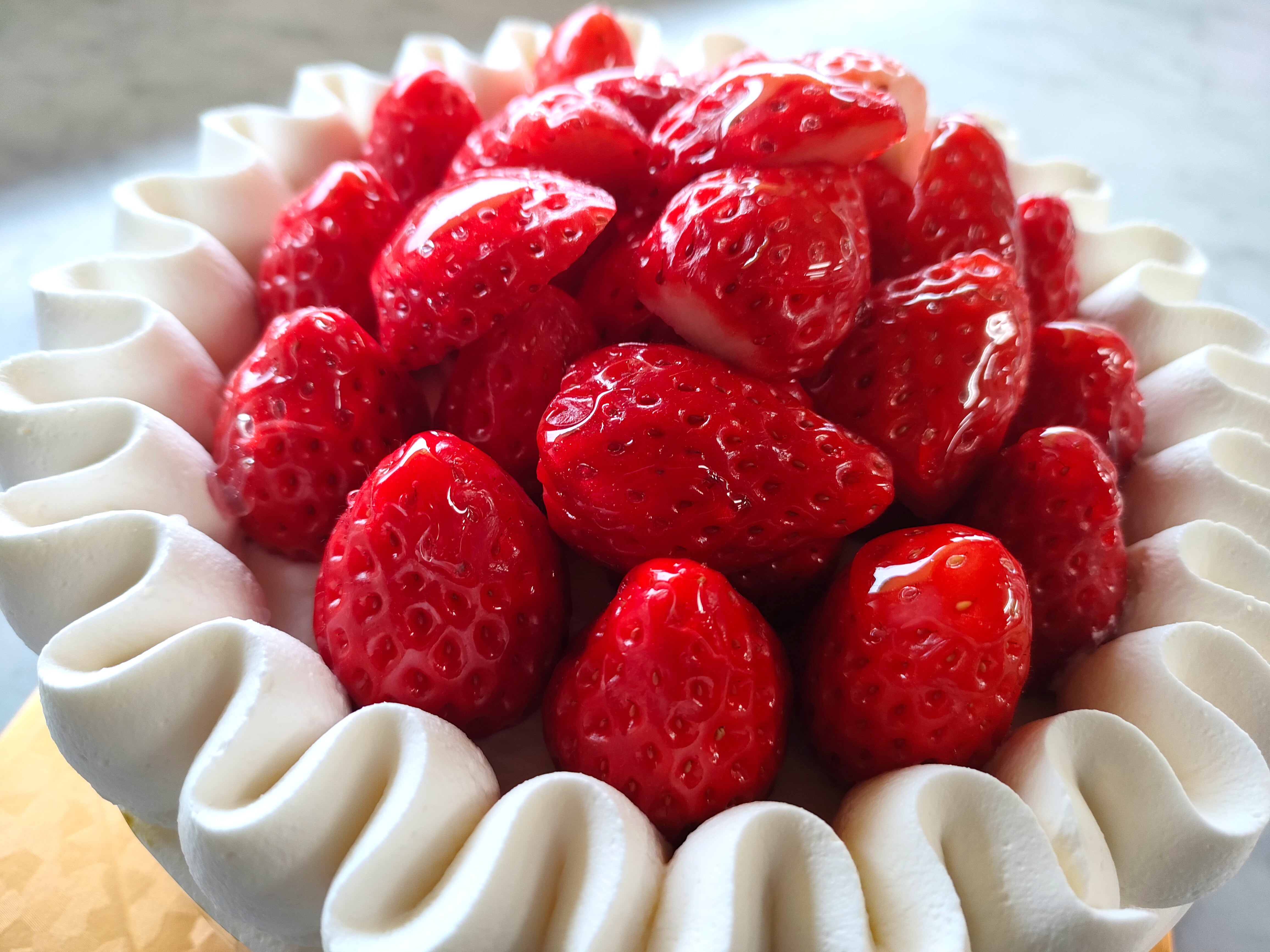 優しい甘さのクリームとジューシーな苺をたっぷり盛りつけています。