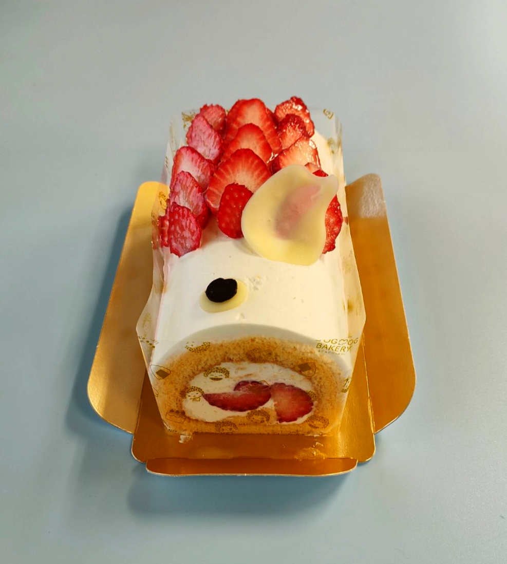 新鮮な苺とクリームをふわふわロールケーキ生地で巻いています。